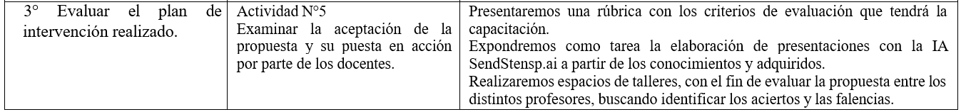 Con las actividades propuestas dentro del plan de intervención. Se pretenderá que los docentes logren desarrollar habilidades vinculadas a las nuevas tecnologías de Inteligencia Artificial (SendSteps.ai). Y que puedan analizar de manera crítica cuáles serán las alternativas que podrán usar para llevar adelante sus actividades de un modo coherente incentivando los trabajos grupales como individuales en la creación de presentaciones interactivas y que representen una evolución dentro de las actividades desarrolladas en el instituto Santa Ana.