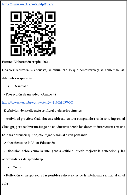 Presentación del plan de intervención a los docentes por medio de un soporte gráfico creado con GAMMA plus. https://gamma.app/docs/Inteligencia-Artificial-para-Docentes-b4c5pmmnyskp2yq