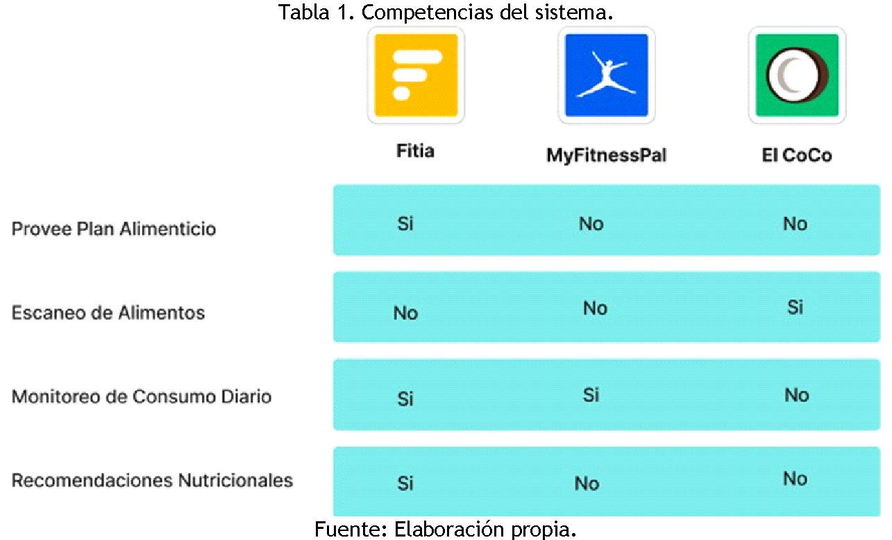 The figure 1 shows a comparative analysis of some existing applications on the market that focus on food planning.(7) Each of these applications offers different features, from food scanning to monitoring eating habits, but they differ in how they address these needs. The analysis seeks to highlight the main features of each application and its specific approach to helping users improve their diet.