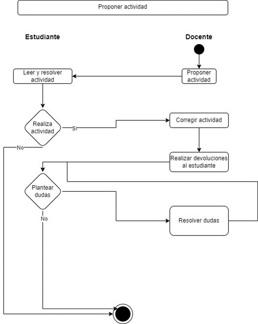 Pasos: una vez llevado a cabo el proceso anterior, el docente propone una actividad a desarrollar para que el estudiante ponga en práctica los contenidos aprendidos. Una vez resuelta la actividad el docente corrige la misma y hace las devoluciones correspondientes. En caso de tener dudas sobre las correcciones es el momento en el que el estudiante consulta. El docente resuelve las dudas hasta que no haya nuevas dudas y finaliza el proceso.