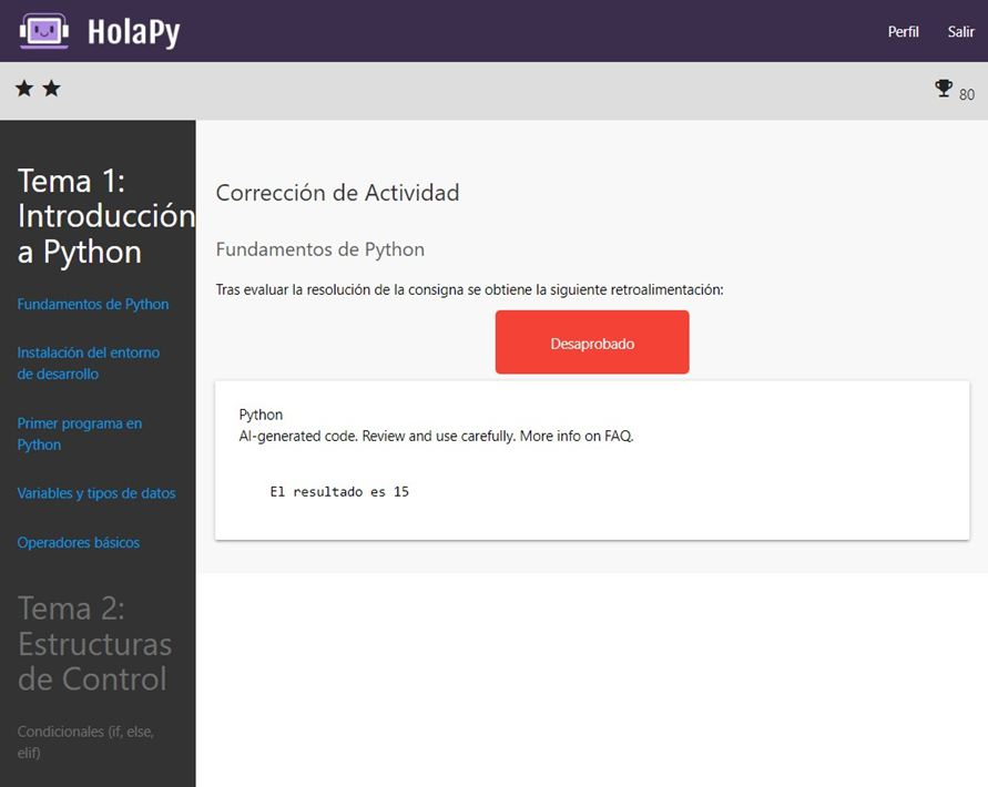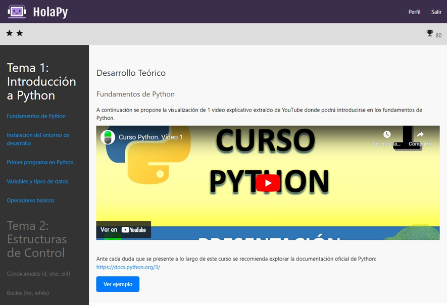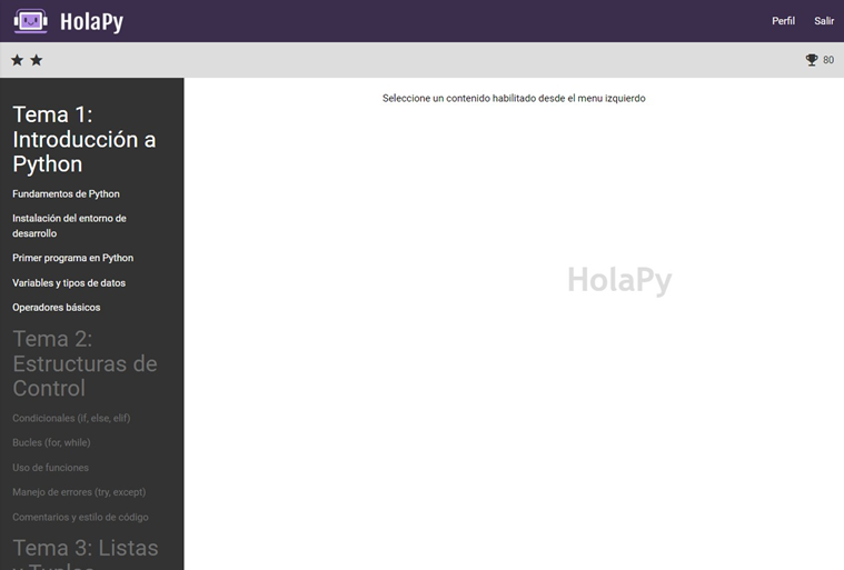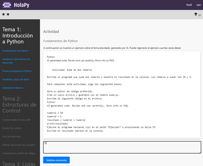 La aplicación comprende desde la lectura del material teórico de los temas más básicos, hasta el desarrollo y corrección de actividades utilizando inteligencia artificial.